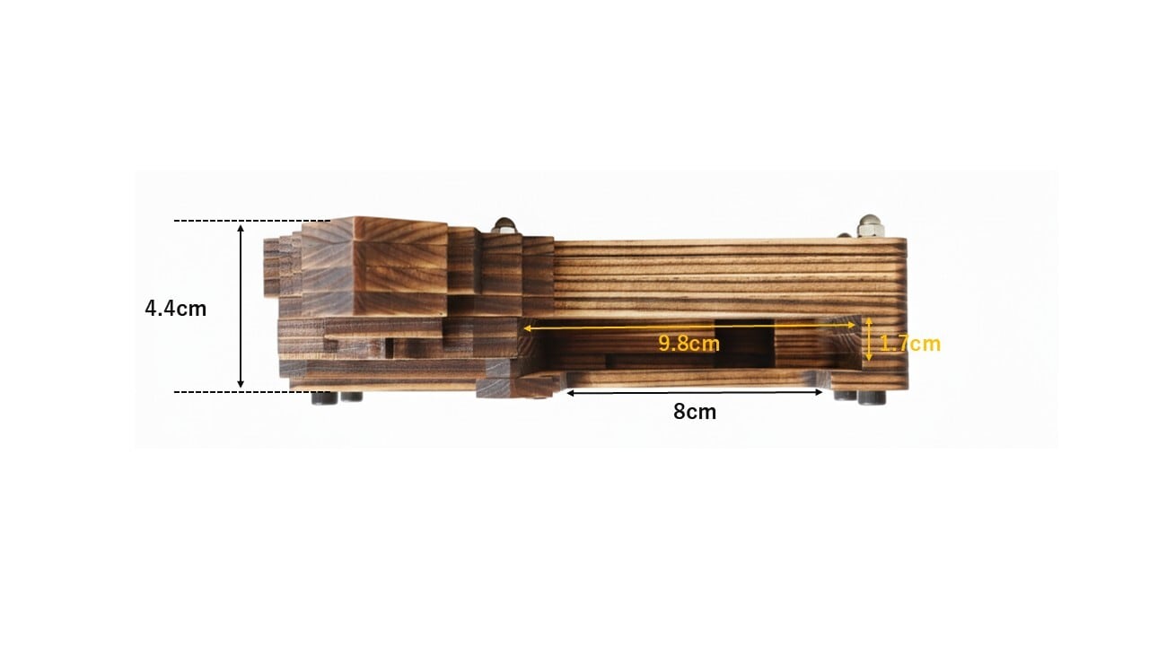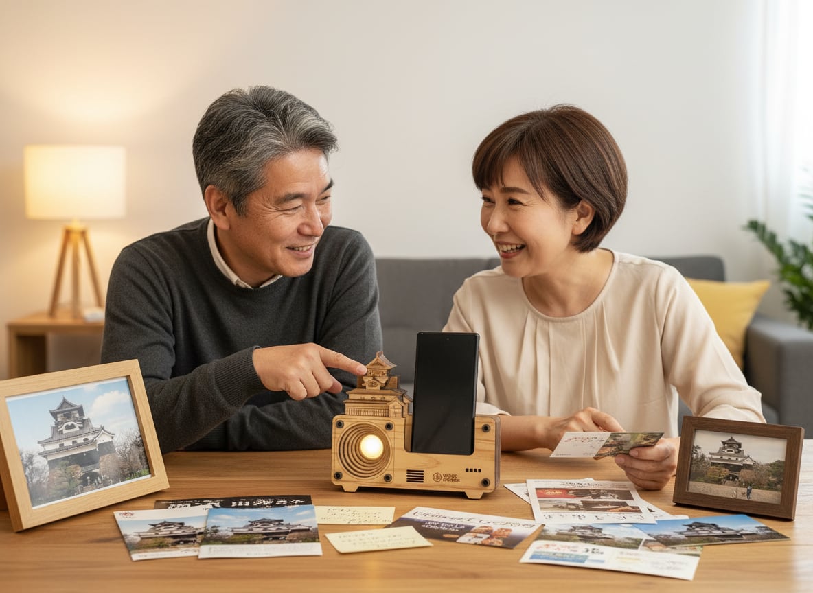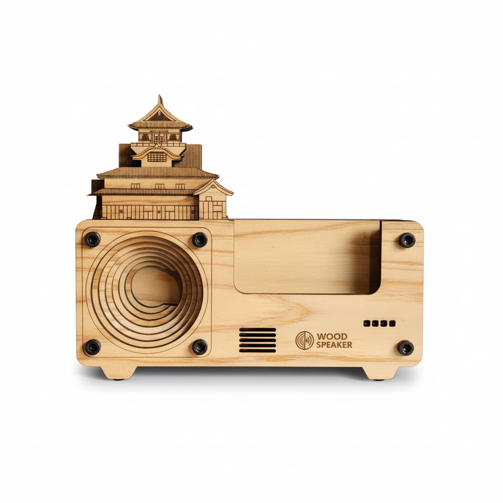 犬山城をモチーフにした、電源不要の木製スピーカー。