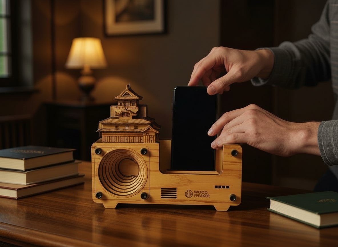 スマートフォンを差し込むだけで、木が共鳴し、音がやわらかく広がります。