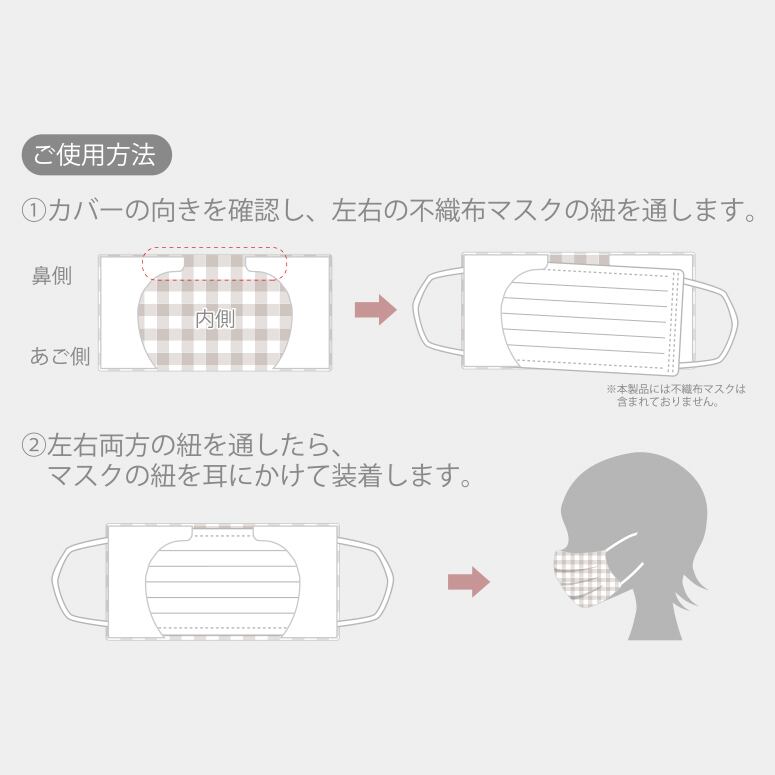 ①マスクカバーの向きを確認し、左右の不織布マスクの紐を通します。